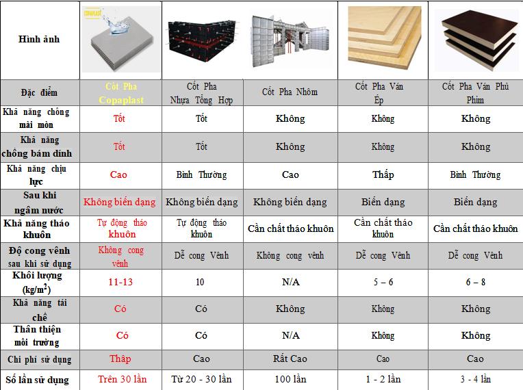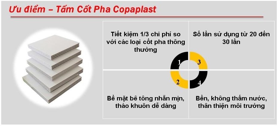 So với các loại Cốt pha truyền thống như sắt, nhôm, gỗ… thì tấm cốt pha Copaplast được mệnh danh là Cốt pha thế hệ mới với nhiều đặc điểm tối ưu. Chắc chắn, vật liệu Copaplast sẽ là người bạn đồng hành đáng tin cậy của những chủ thầu xây dựng.